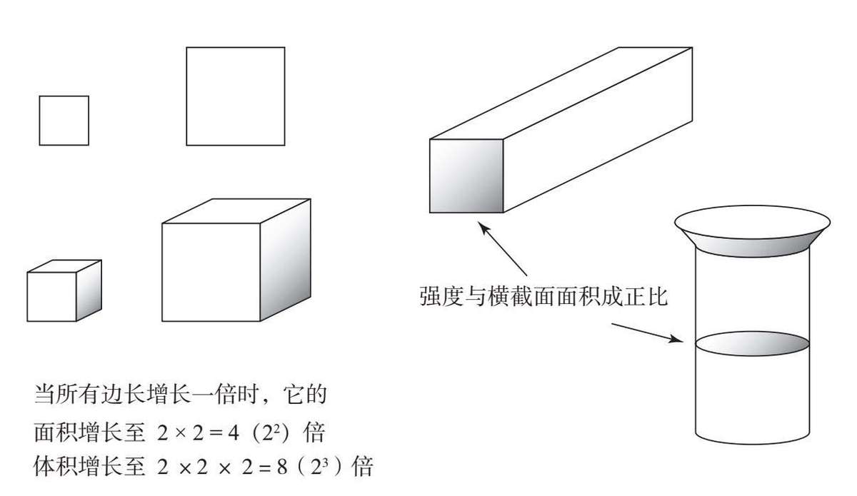 在伽利略之前的许多人可能都曾意识到面积和体积按比例缩放的根本不同。他所贡献出来的新洞见在于将这一几何学上的发现和他的发现结合在一起,即柱梁和肢干的强度是由它们的横截面面积决定的,而不是由它们的长度决定的。因此,假设一根柱子的矩形横截面面积为2英寸×4英寸(=8平方英寸),那么它便可以支撑4倍于横截面边长只有它一半的类似材料制成的柱子所能支撑的重量,而无论这些柱子有多长。第一根柱子可以是4英尺长,第二根柱子可以是7英尺长,这都没有关系。这就是参与建筑的建筑工人、建筑师、工程师都要根据横截面面积挑选木材的原因,也是家得宝和劳氏公司的木材区在展示木材时要注明“2×2、2×4、4×4”等尺寸的原因。