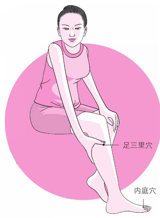 足三里这个穴位可能大家都知道,它是一个可以帮助你把吃进去的食物转为营养物质,不至于以脂肪的形式停留在体内的穴位,是健脾的要穴。对于因为脾气虚而发胖的人,这个穴位是要经常按摩的。同时,如果你确实吃得很多,食欲总是很旺盛的话,还有一个“止饿穴”,即内庭穴,就在第二个脚指头缝上,捏的时候可以上下一起捏,按摩三五分钟。如果你只是单纯地老想吃,胃口特别旺的话,这个穴位可以帮你控制食欲。