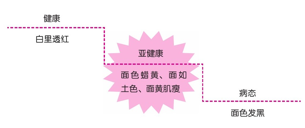 和白里透红的健康肤色相比,黄色的面色就是变深了之后的肤色,也就是细胞被氧化的结果,所以中国人形容病态时有很多类似的成语——“面色蜡黄”“面如土色”“面黄肌瘦”,其中都包含了“黄”。这种比白色深、比黑色浅的颜色,其实是在提示你,身体已经处于消耗状态,如果再过度使用就要变生疾病了。