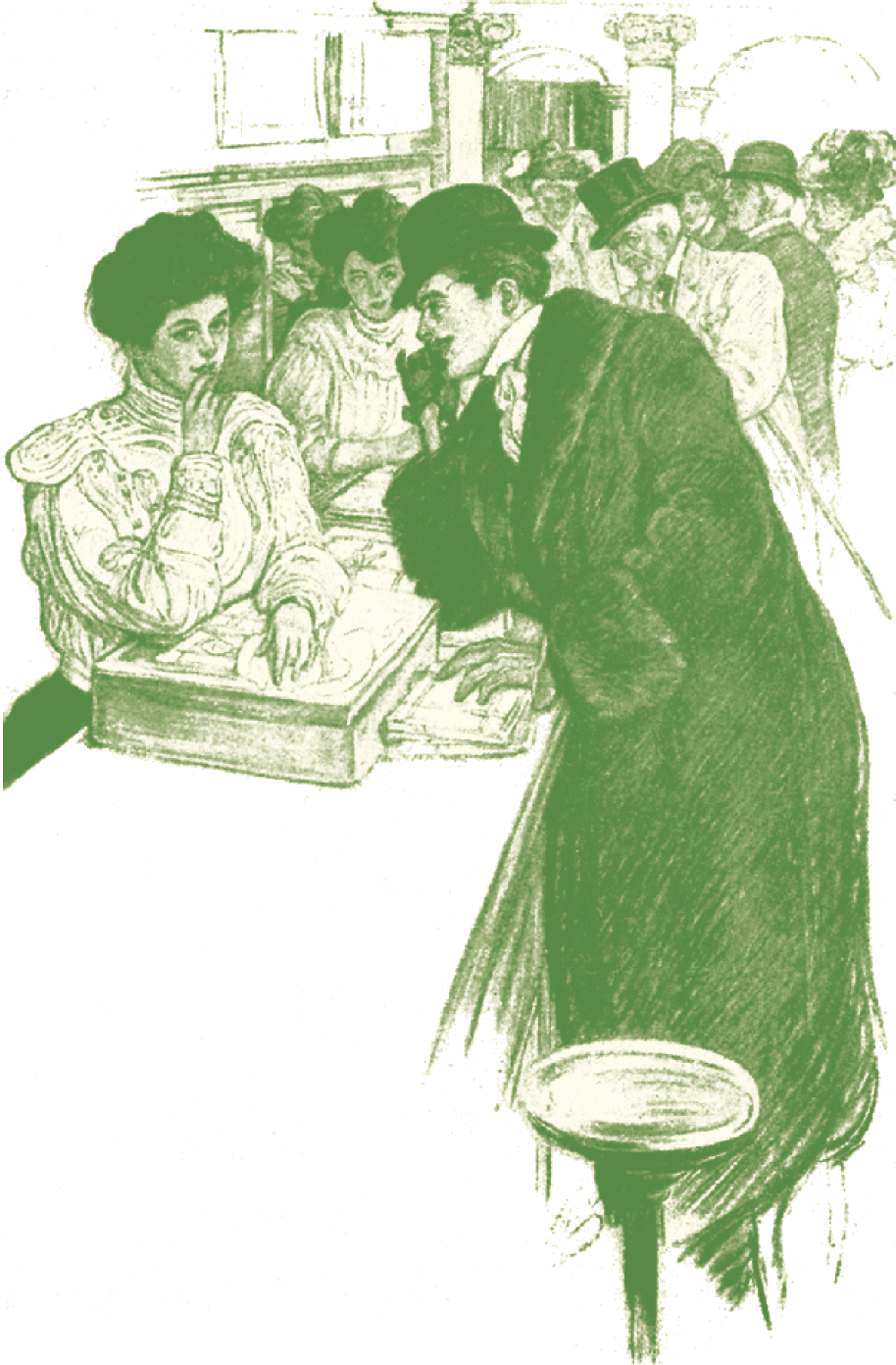 苏贝把女教士送给他的活扣领结拉拉挺,又把皱缩在衣服里面的衬衫袖管拖出来,风流自赏地把帽子歪戴在额头,向那少妇身边挨过去。他对她挤眉弄眼,嘴里哼哼哈哈,嬉皮笑脸地摆出浪子那色胆包天,叫人恶心的架势。苏贝从眼角里看到警察正牢牢地盯着他。少妇让开了一步,仍旧全神贯注地瞅着那些刮胡子用的杯子。苏贝凑上去,大胆地走近她身边,掀起帽子说: