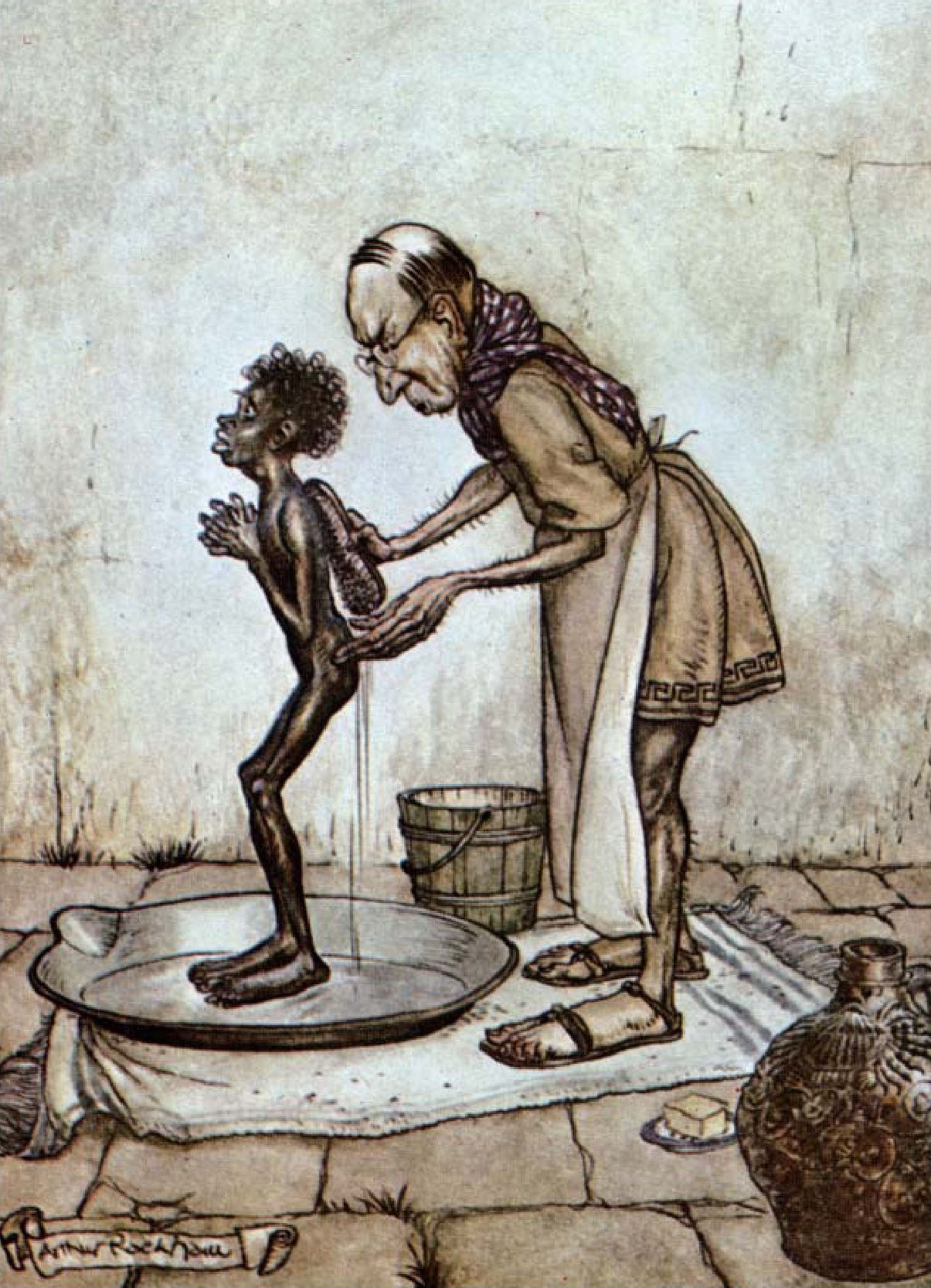 他把黑奴带回家后,用许多肥皂和水想要把他洗干净。