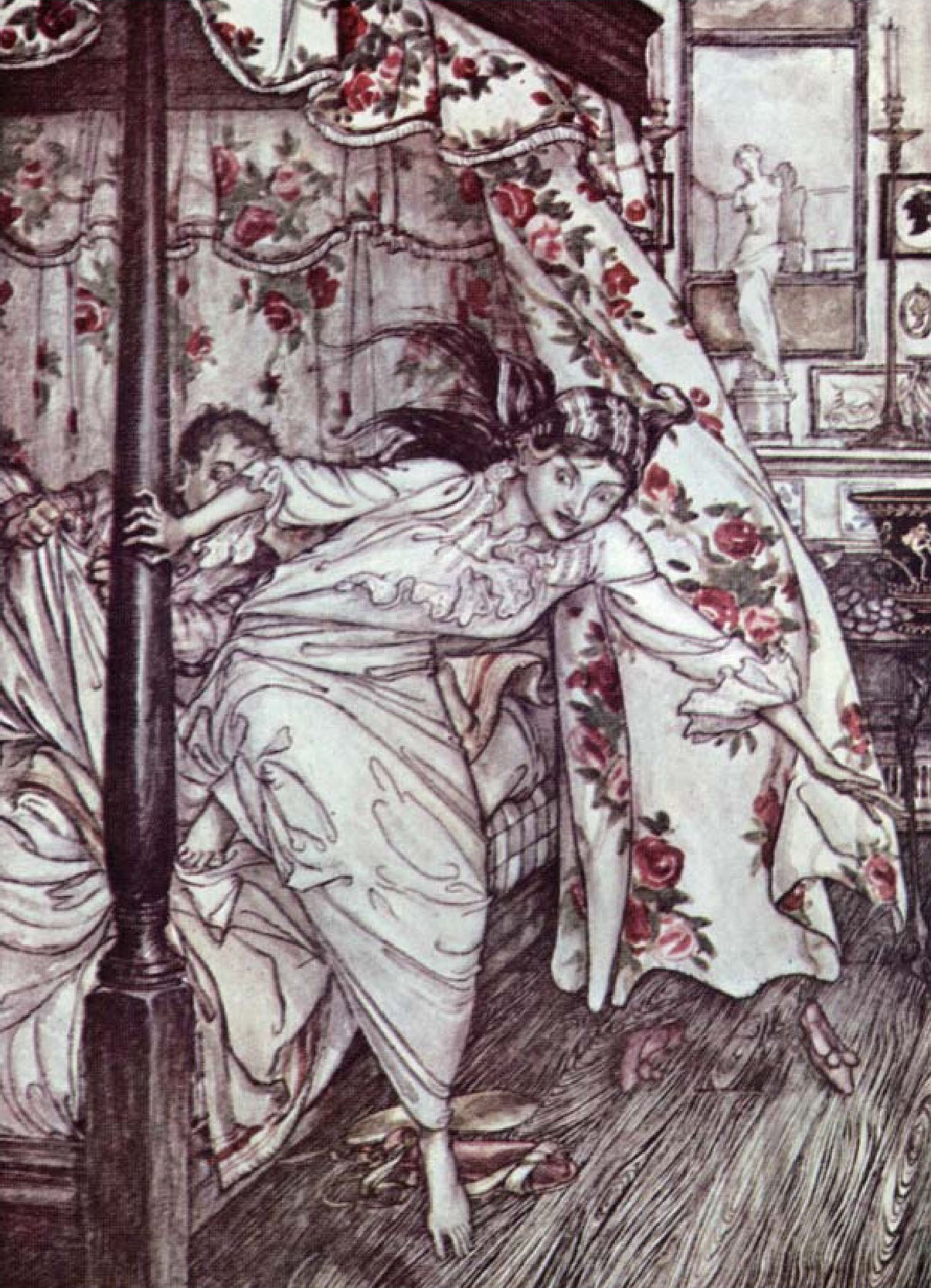 那个女人忘了自己的身份,立刻跳下床,去追老鼠,想吃掉它。