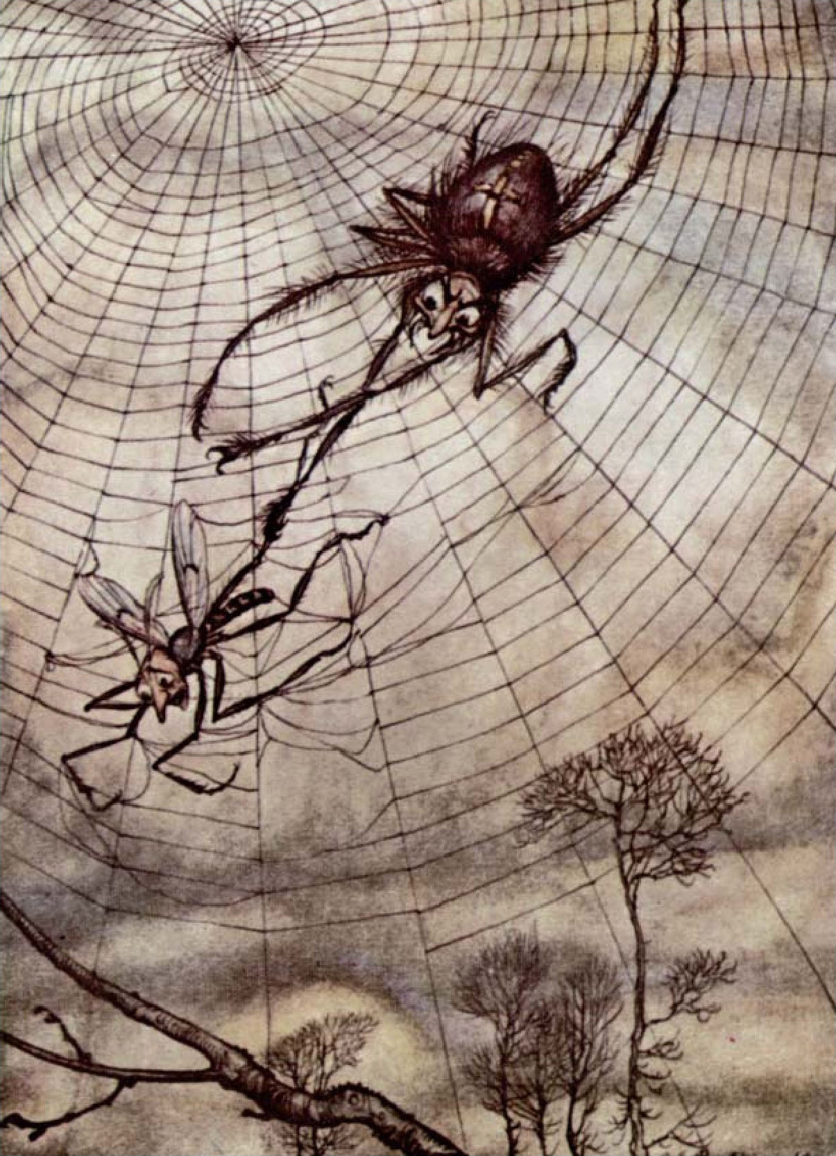 蚊子战胜了狮子,吹着喇叭,唱着凯歌,在天空中飞来飞去,没想到却刚好被蜘蛛网给粘住了。