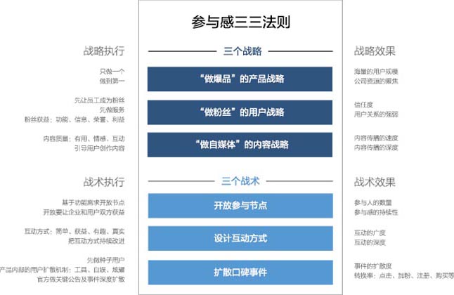 构建参与感,就是把做产品做服务做品牌做销售的过程开放,让用户参与进来,建立一个可触碰、可拥有,和用户共同成长的品牌!我总结有三个战略和三个战术,内部称为“参与感三三法则”。