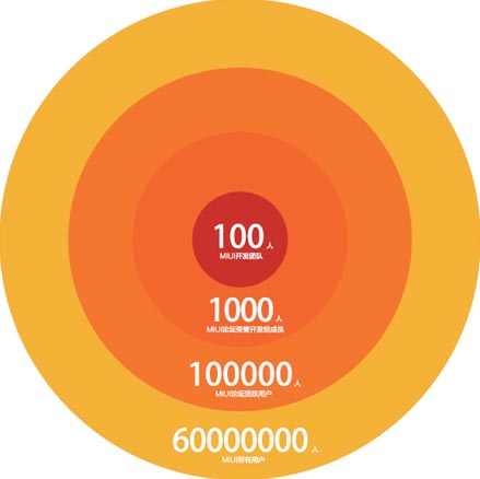 MIUI以论坛建立起的10万人互联网开发团队,团队核心是当时我们官方的100多个工程师,核心的边缘是论坛人工审核过的有极强专业水准的1000个荣誉内测组成员,最活跃的用户是10万个对产品功能改进非常热衷的开发版用户,最外围的是发展至后来有千万级的MIUI稳定版用户。他们都在以自己的方式积极地参与到MIUI的迭代完善中来,其中我们的荣誉内测组被称为“荣组儿”。