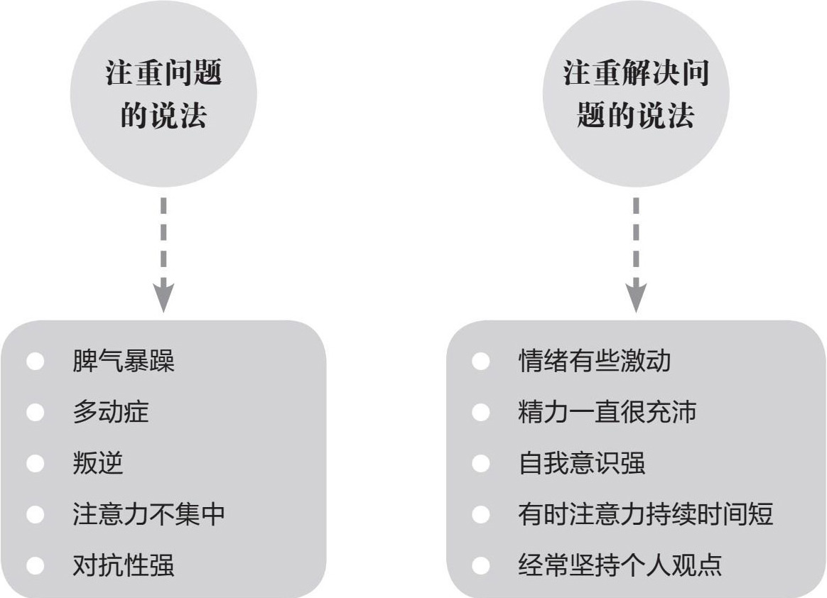 “其实,不论是大人还是孩子,都不愿被扣上‘脾气暴躁’‘易怒’‘不安分’这类标签。如果我们仍然以冷漠、批判、控制、居高临下、自以为是的方式去评价孩子身上出现的问题,那获得的一定是孩子的抵触情绪甚至是更激烈的反抗,而不可能换来孩子的积极配合。所以,作为家长,必须要学会用新观点看待老问题。换句话说就是,用积极的态度去看待孩子身上的问题,要相信问题的反面就是机遇,就是帮助孩子学习掌握新技能的机遇,就看你是如何引导孩子将消极问题转变为积极行为的了。”