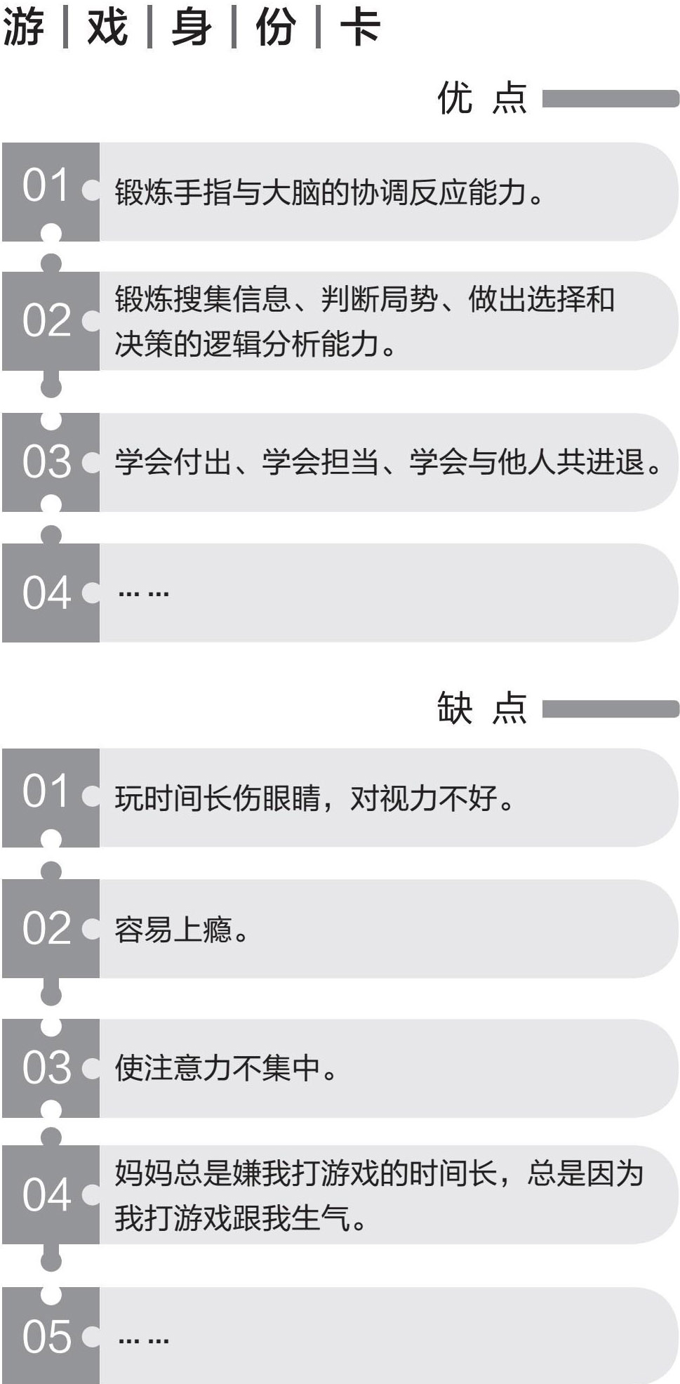 “别急呀,网络游戏的身份卡还没写完呢!你看,我们刚刚只是写了一些它能带给你的好处,却还没有写它的不好的地方呢,是不是?”