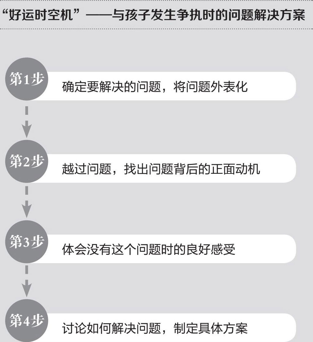雯静笑着说:“其实很简单,分四步:1.当你们确定了要解决的问题后,先将问题独立出来、外表化;2.直接越过问题,不去讨论它,而是一起找出问题背后的正面动机;3.一起回忆过去某一段没有被这个问题困扰的时间,体会那个时候的良好感受;4.再回到当下,一起讨论如何积极地解决这个问题,并制定具体的实施方案。”(见图1-5)