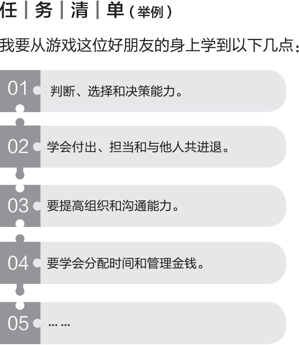 雯静笑着说道:“它当然可以帮你进步啊!你看,网络游戏不仅可以锻炼你手指与大脑的协调反应能力,还能锻炼你搜集信息、判断局势、做出选择和决策的逻辑分析能力。多人组队游戏可以让你学会多角度观察和思考,提高你的组织能力和沟通能力,学会付出、学会担当、学会与他人共进退。网络游戏里蕴含着军事、历史、数学、生活常识等方面的信息,为了打好游戏,你就要不断去了解、去学习,慢慢地丰富你的知识库。当然,网络游戏能帮你进步的地方还不止这些,它还能提升你对时间和金钱的管理能力。为了争取到足够的游戏时间,你写作业就不会拖拖拉拉,零花钱也不会乱花,而是学会存钱以备游戏升级、购买装备的需要,等等这些,我就不一一列举啦。这可是你的好朋友,你要回去慢慢想、慢慢写,把它的好处都找出来,然后让它帮你进步。”