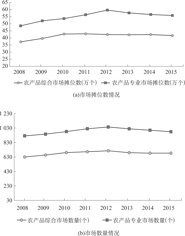 近年来,批发市场以外的农产品流通渠道模式也在快速发展。从统计数据可以看出,我国农产品综合市场、专业市场的数量及摊位数在2012年出现了增长拐点的特征,如图2-3所示。总的来看,批发市场流通模式适应于数量大、规模小,且主要采取对手交易形式的农产品批发商主体;而交易主体的规模化发展,将对传统的农产品批发市场形成某种替代。当然,受制于我国农业产销主体分散化的现状,这种变化需要经历一个较长的时期。