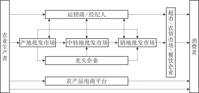 目前,我国农产品流通过程中出现了多种渠道模式,呈现长渠道与短渠道并存、批发主导与零供对接并存的多样化发展态势(见图2-2)。