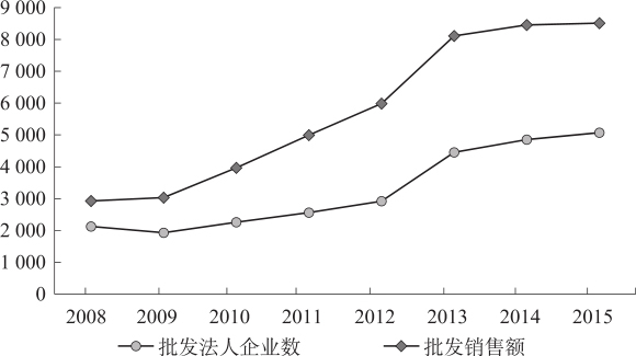 (1)农产品批发企业。批发企业是专业化的流通主体,能够在促进农产品中间流通环节的组织化、集约化发展过程中发挥重要作用。从统计数据可以看出,近年来农畜产品批发企业的数量和交易规模均呈明显的上升趋势,如图2-1所示。