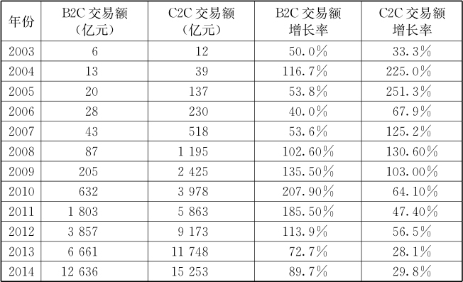 表2- 3 B2C、C2C电子商务交易额及增长率