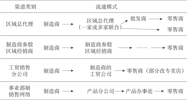 (3)耐用消费品。渠道模式趋于扁平,渠道成员间利益矛盾表现突出。耐用消费品是指那些使用寿命较长,一般可多次使用的消费品,包括家用电器、家具、汽车等。从消费者的角度看,耐用消费品由于购买次数少,因而购买行为和决策较为慎重,同时对售后服务的要求相对较高;从经销商的角度看,产品价值较高,如果周转不畅,容易造成资金积压;从制造商的角度看,近年来,汽车、家电产品的市场竞争趋于激烈,因而控制销售渠道、压缩流通成本的要求十分明显。由此,耐用消费品的流通渠道呈现一定的扁平化趋势,制造商控制销售体系、直供零售终端、自营售后服务的现象较为普遍,但传统经销商、批发商仍然在渠道中发挥着重要的作用。