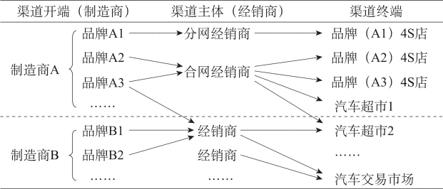 就汽车流通渠道而言,近年来,制造商和经销商谋求渠道利益的方式和趋向体现出新的特征。从制造商的角度看,分网经营打造自主品牌形象、提升渠道控制力的做法已被国内汽车制造商采用。汽车制造商往往同时生产运营多个品牌,它们可以将自身经营的多个品牌授权不同的经销商进行独立化的渠道销售(分网),也可以授权给同一经销商(合网)。其渠道模式如图2-4所示。根据2017年施行的《汽车销售管理办法》,获得品牌授权不再是销售汽车的强制性要求。在授权与非授权并行的模式下,市场竞争的活力将得到进一步释放。