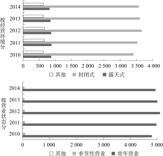 自20世纪90年代初以来,商品交易市场快速发展,表现出较强的生命力,在流通渠道中占据了一席之地。经过多年的发展,商品交易市场的经营环境在不断改善,封闭式交易市场已经占据主体地位,露天式、其他经营环境的交易市场数量逐年减少;从经营状态看,常年经营的商品交易市场处于主体地位,季节性营业或其他营业状态的市场数量相当有限,如图2-6所示。