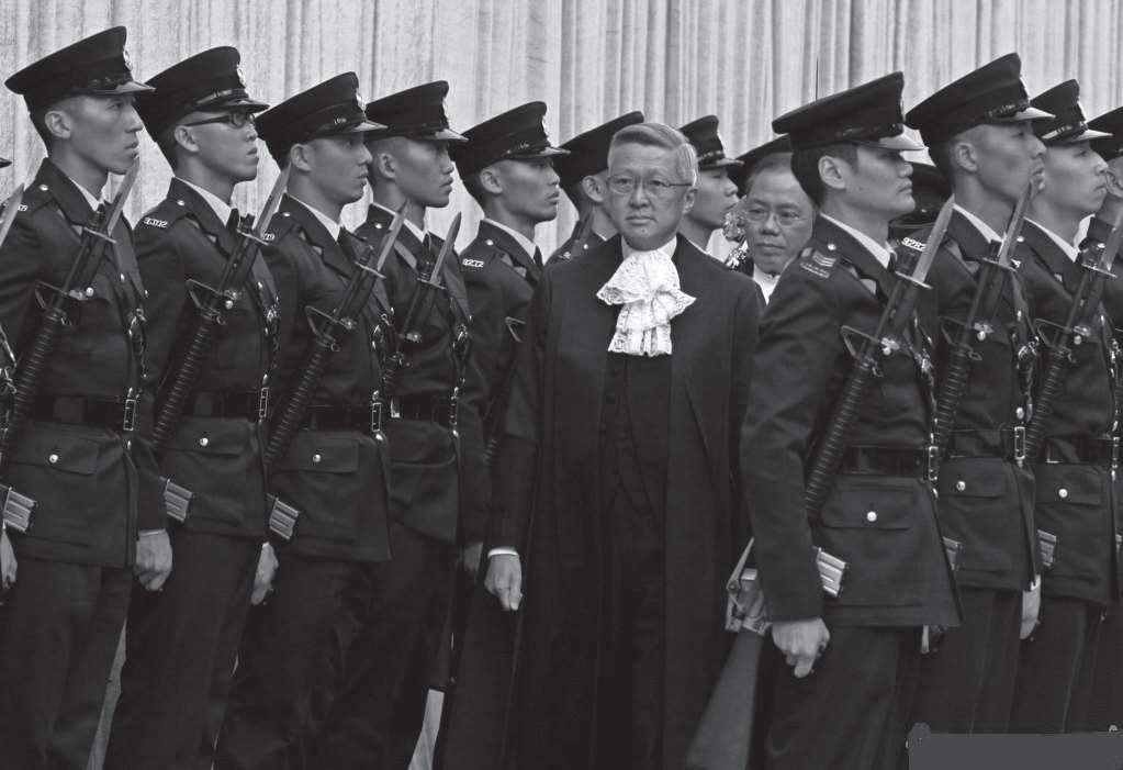 典礼正式开始,李国能首席法官检阅香港警察仪仗队。仪仗队长手举佩剑开道,典礼官肩扛权杖,一路跟随,陪同检阅。百余位法官和资深大律师站在警察仪仗队的对面,注目旁观。权杖象征终审法院首席法官的职权,也象征着司法权威。香港回归以前,权杖的顶端是皇冠,象征英国皇室的权力;1997年7月1日之后,中华人民共和国香港特别行政区的区徽取代了这个皇冠标志,这是“一国两制”方针的生动写照。伯尔曼曾说,仪式、传统、权威和普遍性,决定了法律与宗教的共通性。旁观检阅,可以读出仪式中所彰显的司法尊荣。