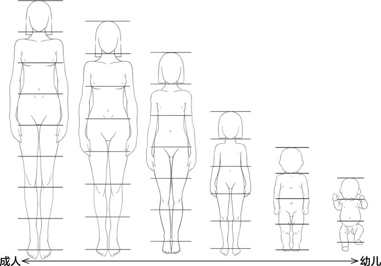 正常的头身比会随着年龄的增长而变化,人的身材比例也会发生变化。在绘制人物时,只有掌握人物的头身比,才能完美地表现角色的年龄,使人物比较生动。