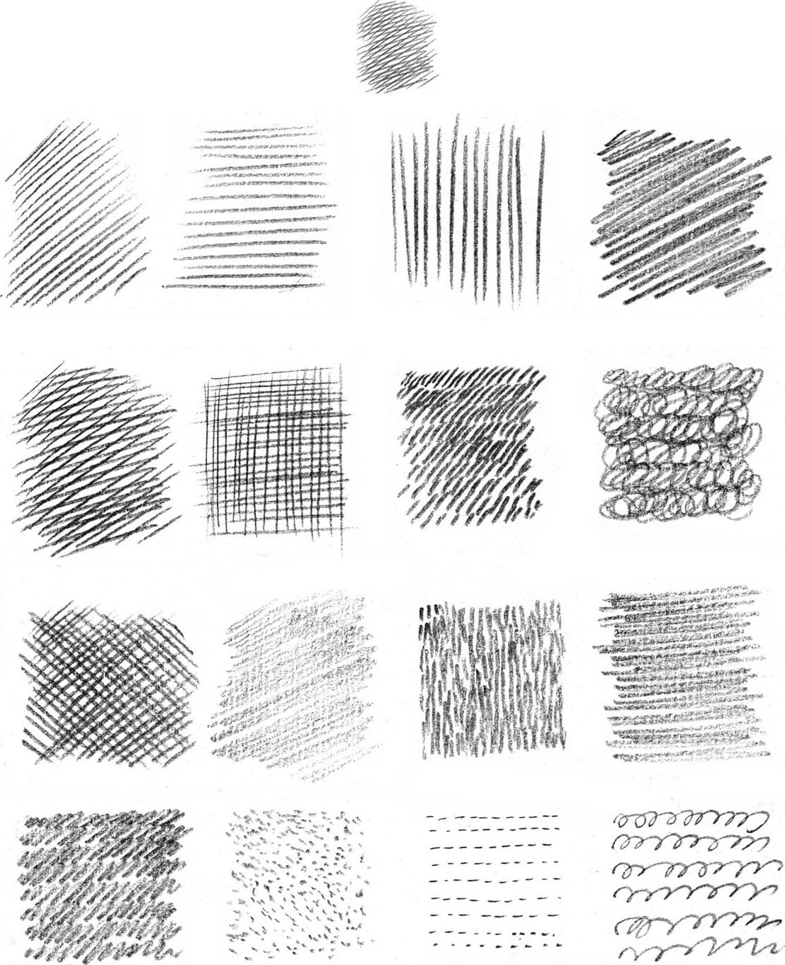 下面为素描中常用的一些线条,即使是颜色单一的铅笔也可以画出多种变化。
