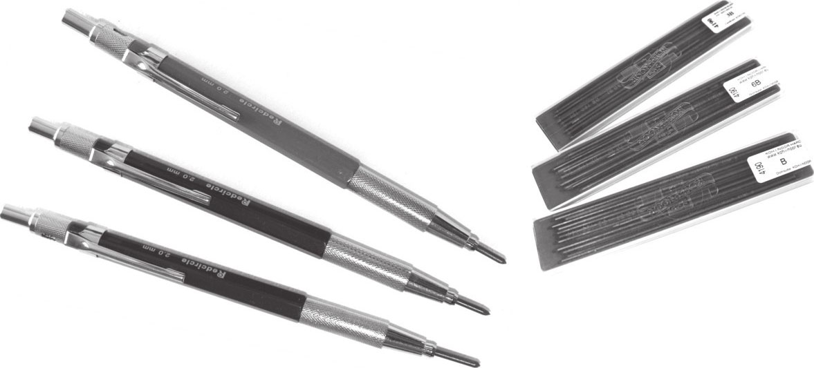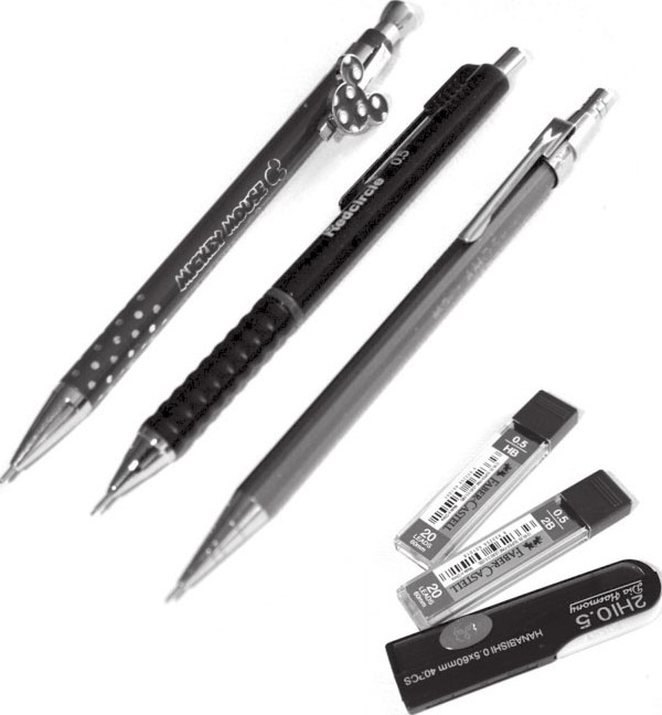 自动铅笔比较方便携带,专业的美术商店也有0.5mm、0.7mm等不同粗细和HB、2B等不同硬度的铅芯销售。