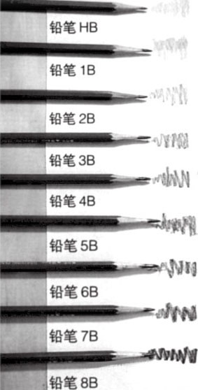 市面上出售的铅笔通常有6B、5B、4B、3B、 2B、B、HB、F、H、2H、3H、4H、5H、6H、7H、8H、9H和10H这18个硬度等级,一般用“H”表示硬质铅笔,“B”表示软质铅笔,“HB”表示软硬适中的铅笔,“F”表示硬度在HB和H之间的铅笔。字母H前面的数字越大,表明越硬,字母B前面的数字越大表明越软。一般HB、B、2B、3B最为常用,也更容易把握。