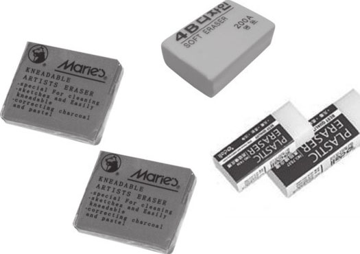常用的橡皮可分为一般橡皮和可塑橡皮两种。一般橡皮常用于绘画的开始阶段,将错误的线条整体擦除;而可塑橡皮常用来做减淡效果。
