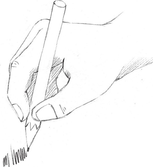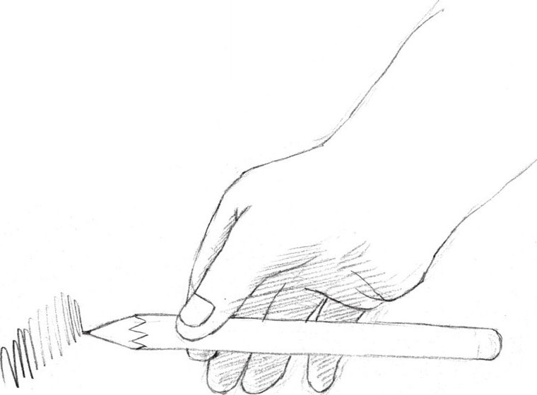 图二: 轻拿笔的前端,把铅笔放倒一些来画。