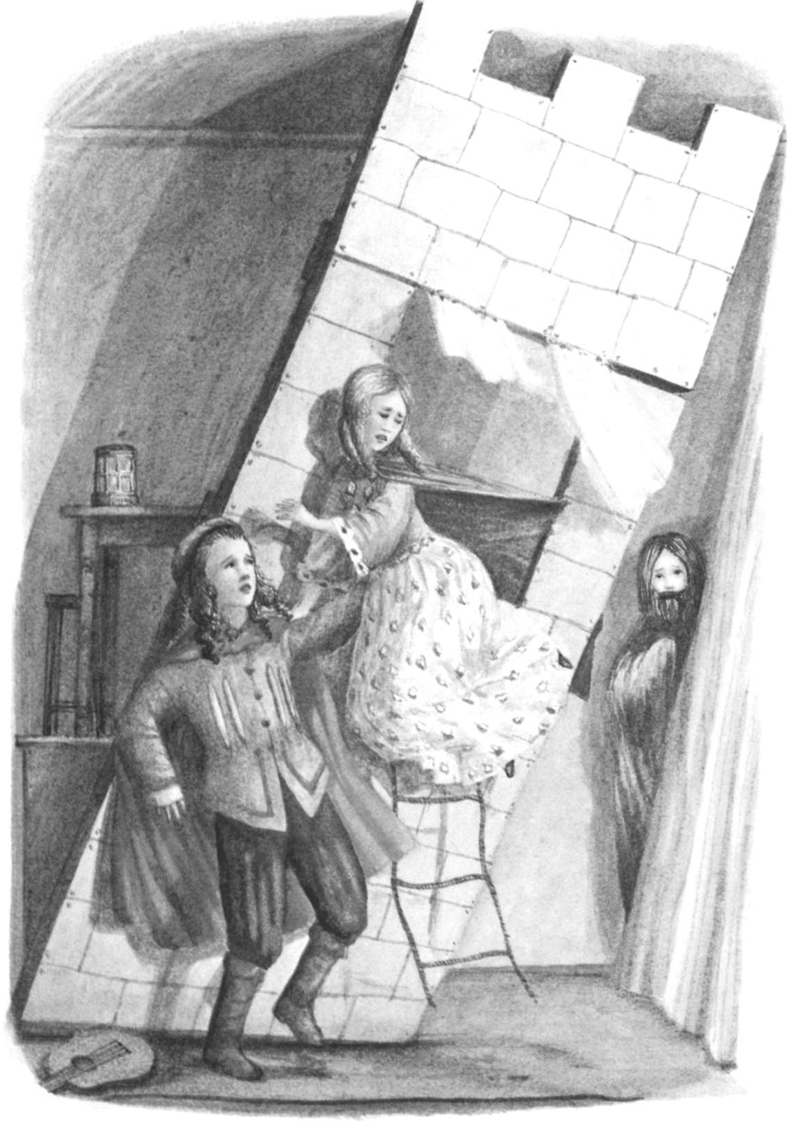 上午的善举和礼仪占用了太长时间,接下来的一天都用于为晚会作准备。姑娘们年纪还小,不能常去剧院,家境又不富裕,没有很多钱用来铺排家庭演出,只有凭了自己的聪慧,动手制作她们需要的道具,需要是发明之母嘛。她们的一些制作十分精巧——有纸版粘的吉他,老式黄油碟覆上银箔做的古香古色的油灯,破旧衣服翻改的华美长袍,上面点缀了闪闪发亮的锡片,是从附近腌菜场拣来的,还有嵌了宝石的盔甲,那宝石本是切割腌菜罐的锡盖后留下的菱形边角料。家具颠来倒去,整个屋子成了童心不泯的欢乐场。