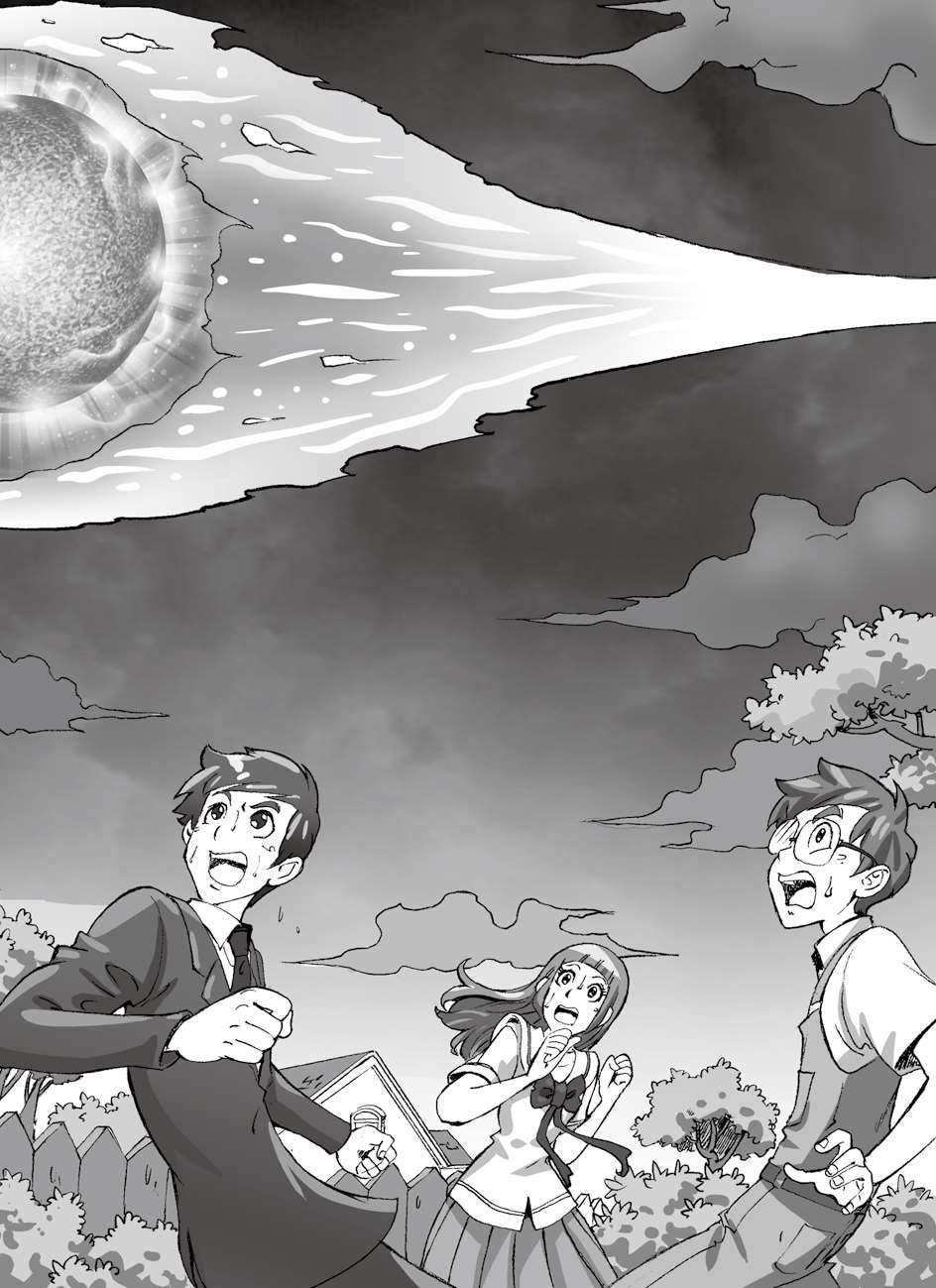 于是,三人风驰电掣般冲出了屋子,当他们跑到花园里时,天空中一个巨大的火球——小天体碎块从他们头顶呼啸而过,径直飞向远处的小山上。小山上现出一片红色的光,接着,“轰隆隆”的撞击声和爆炸声从小山上传来,大地,也随之产生了剧烈的晃动,“校园三剑客”全都踉踉跄跄地摔倒在地。而街上,也传来了人们急促的奔跑声和慌乱的呼叫声。