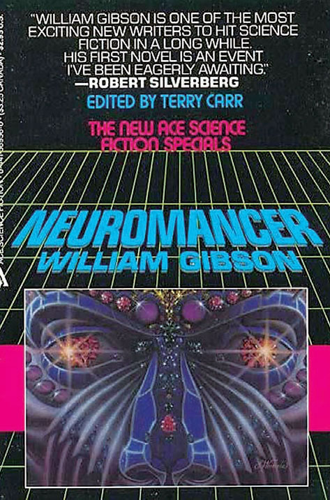 1984年,赛伯朋克史上最重要的一部作品诞生——威廉·吉布森的《神经漫游者》(Neuromancer)。这本书奠定了赛伯朋克的基调:庞大的跨国公司取代政府成为权力中心,通过无所不在的电脑网络对个体生活实施管控;腐败横行、社会疏离;人们沉迷于虚拟实境所提供的廉价娱乐,偏嗜等效于毒品的强力神经刺激;同时,牛仔般的反英雄,在《银翼杀手》般的巨型都市里与更加巨型的阴谋进行着西绪弗斯式的徒劳反抗。