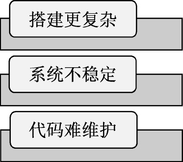 但是业务总会越变越复杂,这点是不可避免的,需求总是没有止境的。业务复杂度的变化会让控制页面的服务层(Service)越来越多,这造成了整个系统的复杂化和多元化。同样,开发团队的扩张也导致参与人员很可能从几个人快速扩展到几十人,在这种情况下会遇到一些典型问题,如图1-1所示。