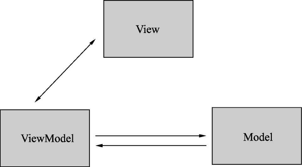 MVVM模式跟经典的MVP(Model View Presenter)模式很相似,需要一个为View量身定制的Model,这个Model就是ViewModel。ViewModel中包含了一个项目文件使用的UI组件的接口和相关属性,可以通过一个相关的视图绑定其属性,并可获得二者之间的相同部分和不同部分。