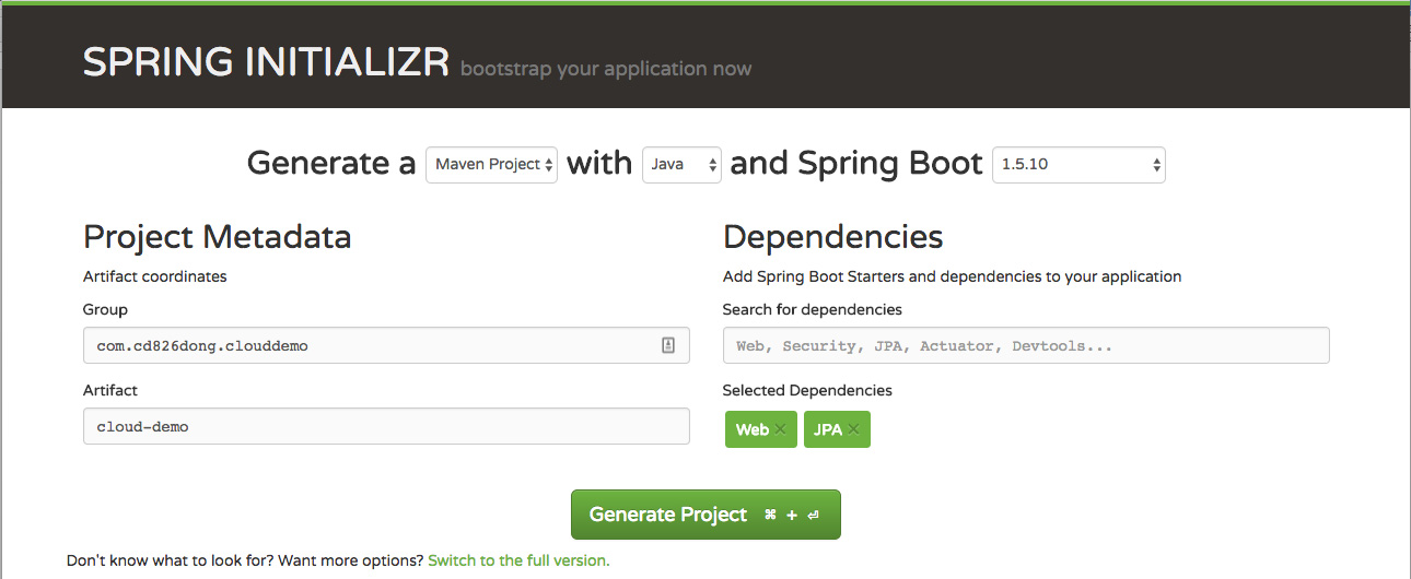 首先,我们将使用Spring Boot快速构建一个最基础的应用框架。我们可以通过Spring Boot初始化工具( https://start.spring.io/ ),如图2-1所示,完成项目框架的搭建,也可以从本书源码中获取项目代码,或从这里( https://github.com/cd826/springcloud-demo )下载示例项目源码。此外,在本书中都会使用Maven来进行项目的依赖管理,如果读者还对Maven不熟悉,可以从这里( http://t.cn/zHwU8G4 )进行了解。假如读者想在项目中使用Gradle而不是Maven,那么可以在IDE环境中直接将Maven脚本转换为Gradle,或通过手工进行转换。