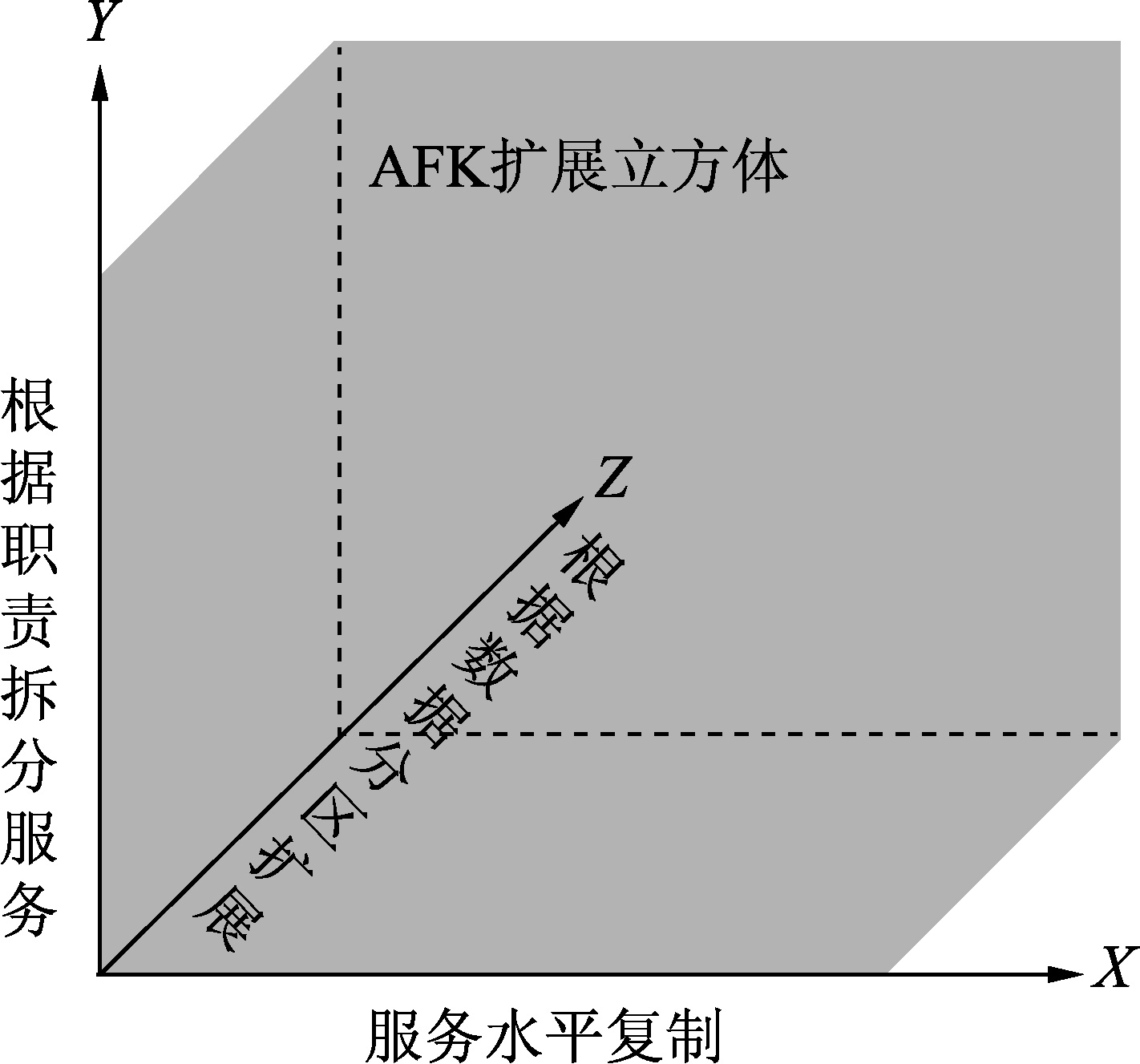 在《架构即未来》(英文名称《The Art of Scalability》)一书中提出了一个可扩展模型: AFK扩展立方体(Scaliability Cube) ,将应用抽象总结出可扩展的三个维度:产品、流程和团队,理论上可按照这三个维度进行扩展,从而可将一个单体系统进行无限扩展,如图1-2所示。