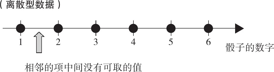 又是“离散型数据”又是“连续型数据”的,刚开始接触这两个术语的时候,可能会很不习惯,而且觉得难以理解。“离散型数据”是指两个相邻的项之间没有可取值的数据。比如骰子的数字1和2之间没有“1.5”,或者对汽车的数量进行计数时,10辆与11辆之间也没有“10.5辆”。将数据放在数轴上时,只能取跨越型数值的数据是“离散型数据”。