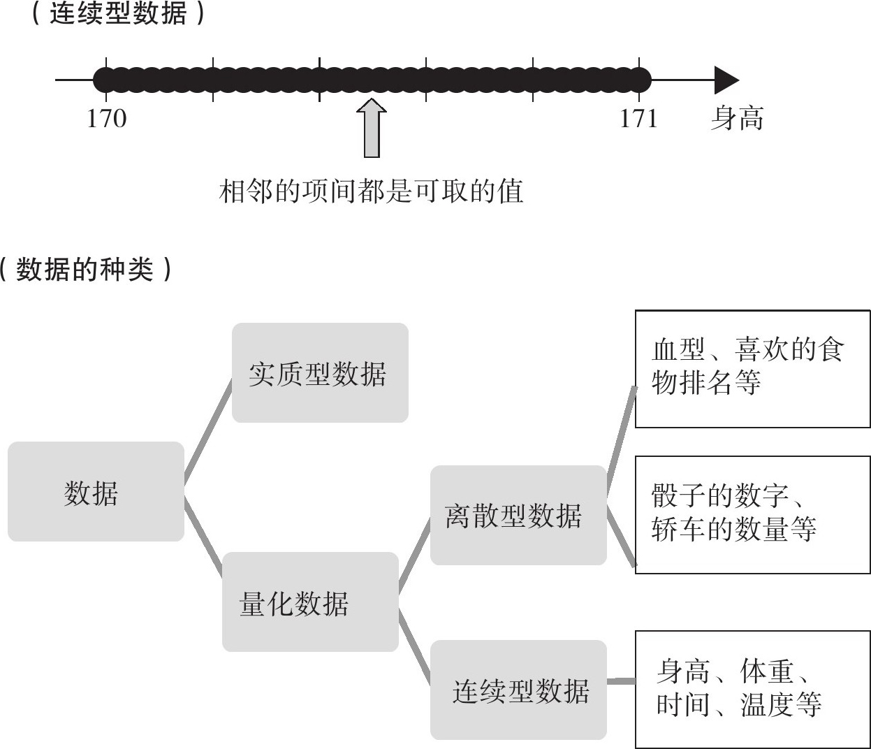 但是,测量身高时,在170cm与171cm之间,有身高为170.5cm的人是很正常的事,而且,如果对测量结果要求严格的话,在170.5cm与170.6cm之间,还会有身高170.55cm的人。像这样,不管怎么细分,永远都有更多可取数值的数据为“连续型数据”。
