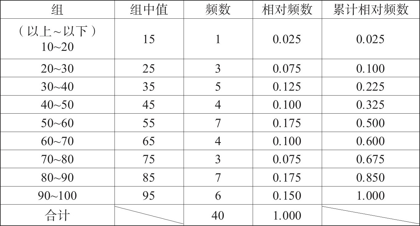(1)频数分布表中无法体现数据中每个项目的具体数值。例如,之前的数据中,“40~50分”一组的数据中实际包括“43、44、44、48”4个数值,但是,在频数分布表中,这一组的组中值为“45”,就是说,在频数分布表中,这些数都被认为是“45”。该组数由组中值代表。
