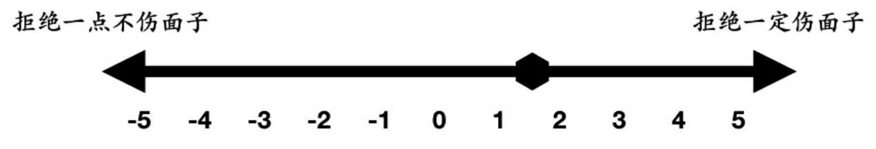 于是我在纸上画了一个标尺。标尺的最右侧代表“拒绝一定伤面子”,所属的分值为5分。标尺的最左侧代表“拒绝一点不伤面子”,所属的分值是-5分。
