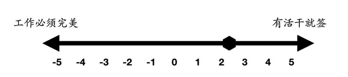 我接着说:“那如果一个人在工作中,无论什么人给她的工作她都扛下来,她这么做表明她在这个标尺上的分值是多少?”
