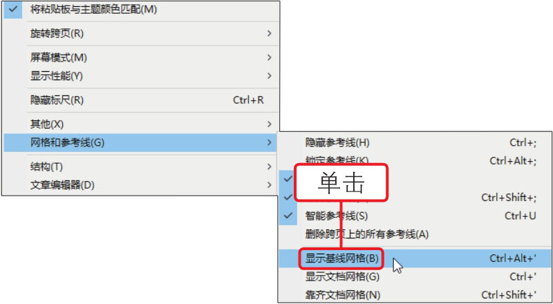 03 设置后单击“确定”按钮,返回文档窗口,再执行“视图>网格和参考线>显示基线网格”菜单命令,如下图所示。