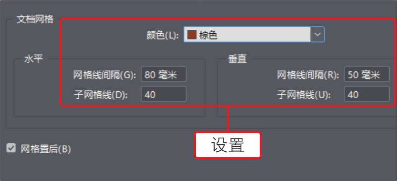 文档网格由交叉和垂直的网格线组成,形成了一个可用于放置和绘制对象的小正方形样式。用户可以自定义网格线的颜色和间隔距离。文档网格可以显示在所有参考线、图层、对象之前或之后,但不能指定给任何图层。