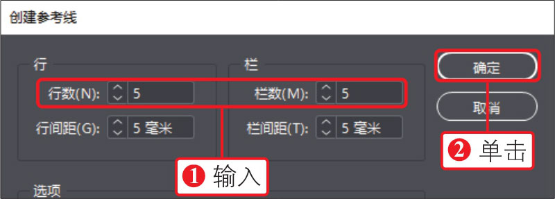 04 如果要在文档中添加均匀参考线,执行“版面>参考线”菜单命令,打开“创建参考线”对话框,①在对话框中设置要创建的参考线的行数、栏数等,②设置后单击“确定”按钮,如下图所示。