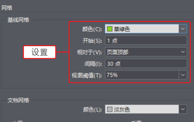 03 执行“编辑>首选项>网格”菜单命令,打开“首选项”对话框,在对话框中选中“网格”选项卡,在右侧设置基线网格选项,如下图所示。
