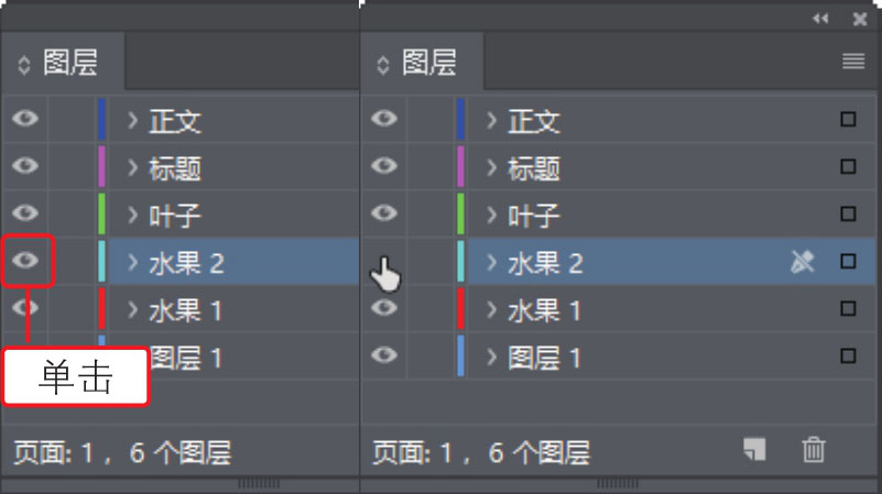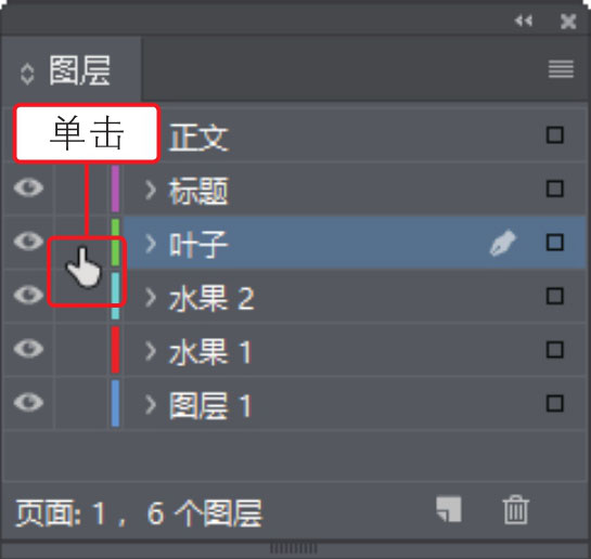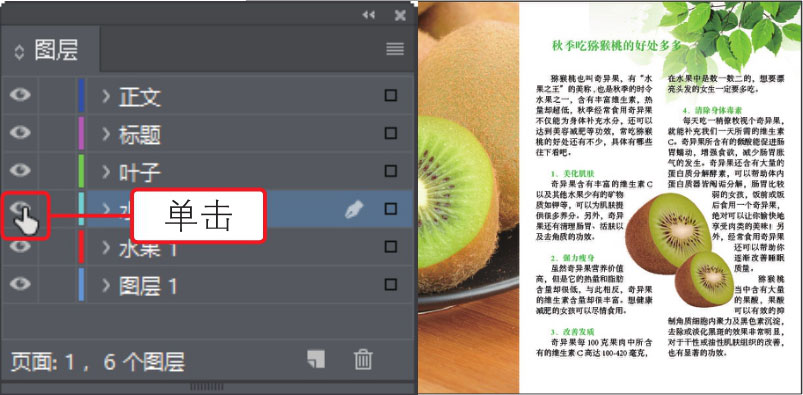 01 打开03.indd,打开“图层”面板,单击需要隐藏的图层前的图层可见性图标,如右图所示。