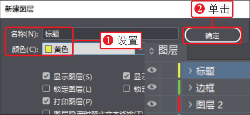 08 打开“新建图层”对话框,①在对话框中设置图层名称,②单击“确定”按钮,即可创建“标题”图层,如下图所示。