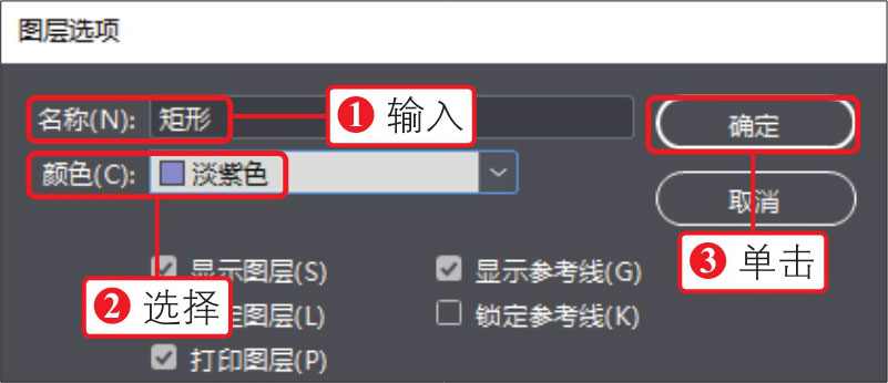 02 双击该图层,打开“图层选项”对话框,①在对话框中重新输入图层名称,②更改图层颜色,③单击“确定”按钮,如下图所示。