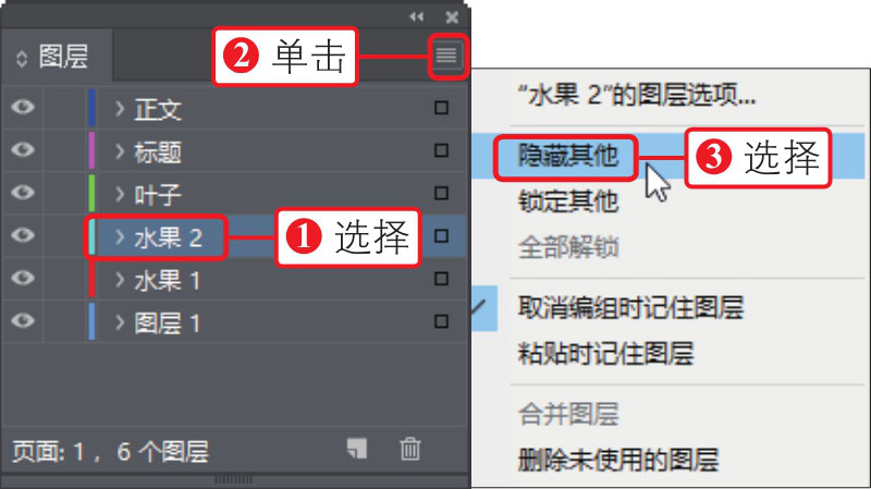 在未隐藏任何图层的情况下,①选择“图层”面板中的一个图层,②单击面板右上角的扩展按钮