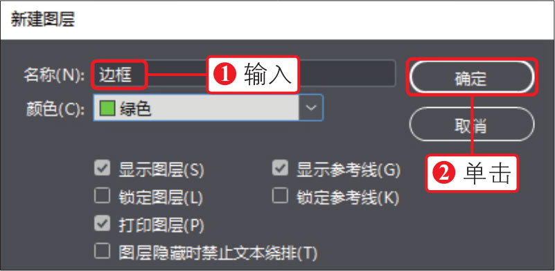 05 打开“新建图层”对话框,①在对话框中输入要新建的图层名称,②设置后单击“确定”按钮,如下图所示。