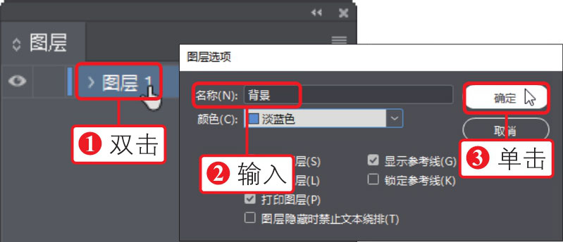 04 打开“图层”面板,①双击“图层1”图层,打开“图层选项”对话框,②输入图层名为“背景”,③单击“确定”按钮,如下图所示。