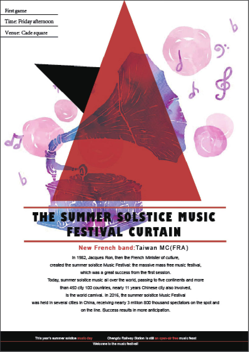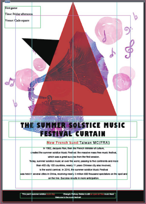 通过创建和设置图层属性可以更好地编辑文档中的内容。本实例将创建一个新文档,通过在文档中创建多个图层,并对创建的图层进行命名设置,将与图层名相关的元素添加到相应的图层中,制作简单的音乐节海报效果,最终效果如下图所示。